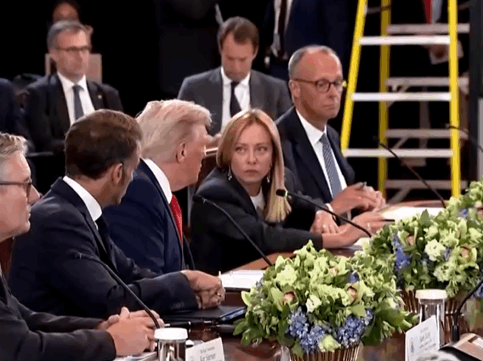 În timp ce presa părăsea sala înaintea unei întâlniri între președintele ucrainean Volodimir Zelenski, Donald Trump și mai mulți lideri europeni, Trump a întrebat-o pe Meloni dacă dorește să răspundă la întrebări. Premierul italian a replicat în engleză: