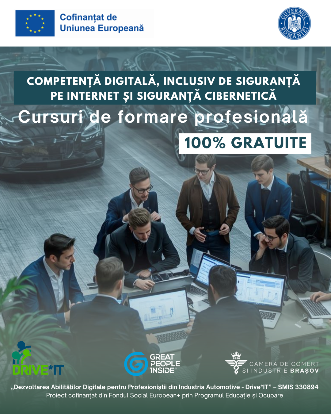 În cadrul proiectului „Dezvoltarea Abilităților Digitale pentru Profesioniștii din Industria Automotive – Drive*IT” implementat de Great People Inside Brașov și Camera de Comerț și Industrie Brașov, punem la dispoziție un curs 100% GRATUIT, acreditat ANC, pentru angajații din companiile încadrate în codurile CAEN 28 și 29 (industria auto și componente), din județul Brașov: