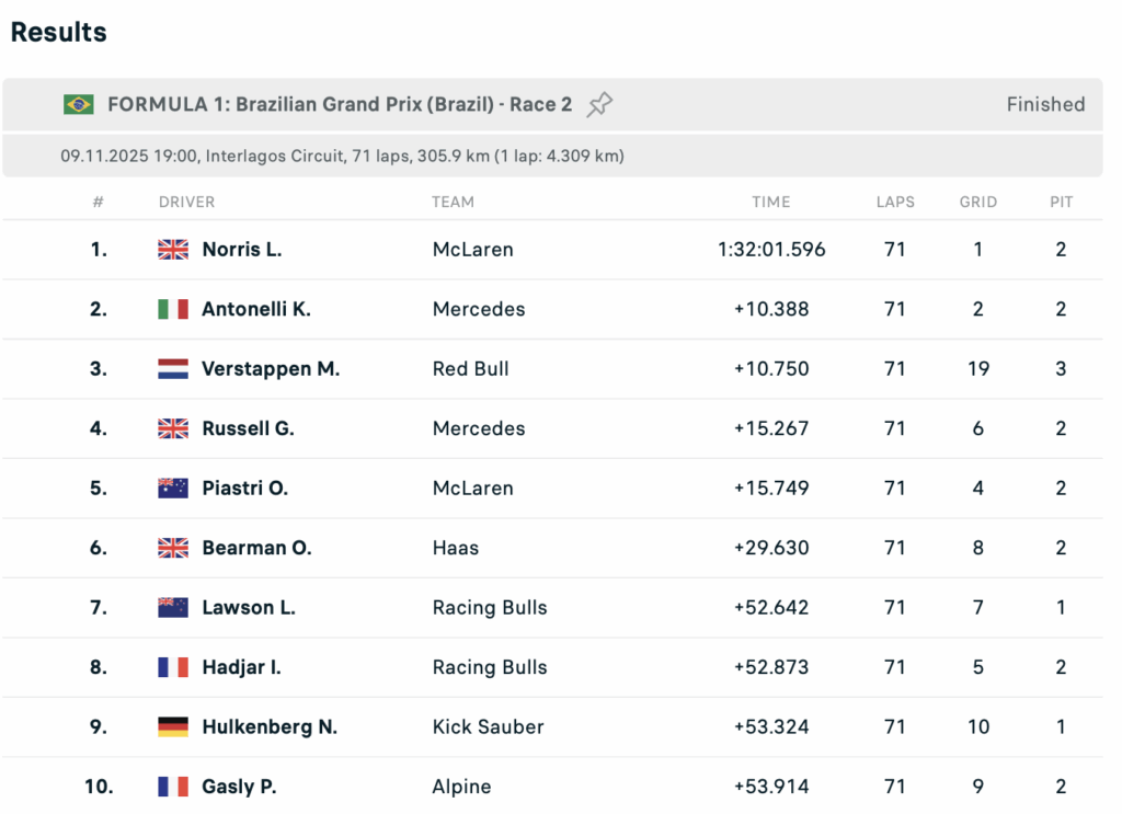 Australianul Oscar Piastri, care a plecat de pe locul patru la Interlagos (în timp ce Norris a fost în pole position), a primit o penalizare de 10 secunde pentru un incident produs la începutul cursei.