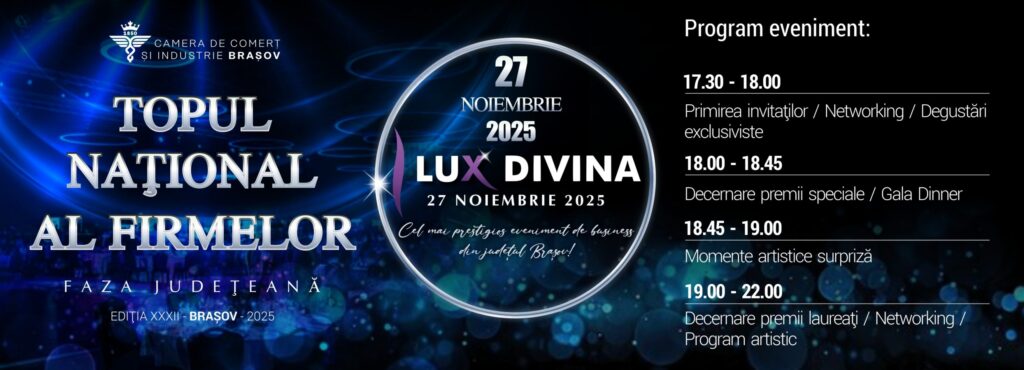 Joi, 27 noiembrie 2025, Centrul de Evenimente Lux Divina din Brașov va găzdui Topul Național al Firmelor – faza județeană, Ediția XXXII, unul dintre cele mai importante evenimente dedicate mediului de afaceri regional. Organizat anual de Camera de Comerț și Industrie Brașov (CCIBV), evenimentul reprezintă un reper puternic pentru companiile locale, aducând în prim-plan performanța, competitivitatea și viziunea antreprenorială.
