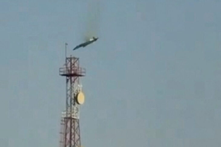 Un videoclip online verificat de Reuters, filmat în zona Al Jahra, arată un avion militar căzând din cer. În același cadru, o persoană se parașutează.