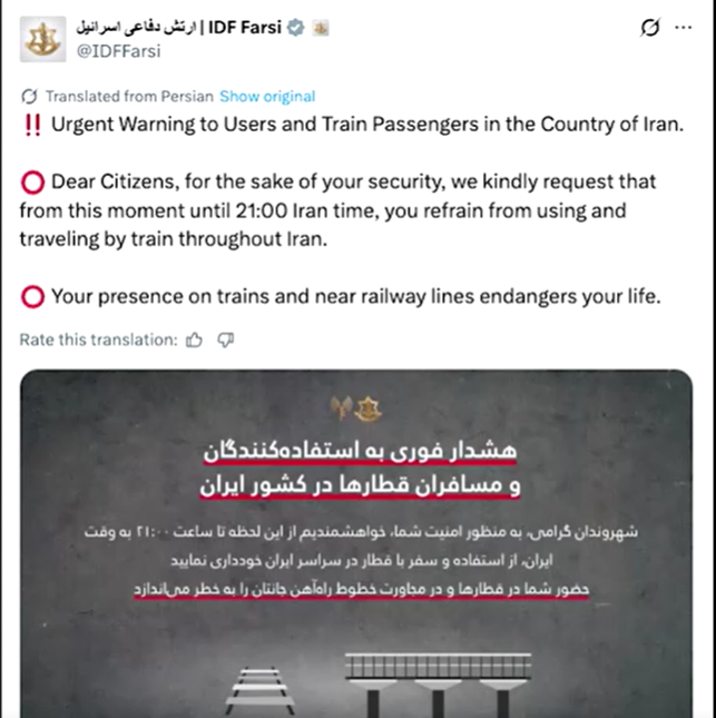 Armata israeliană a emis un avertisment public neobișnuit adresat direct civililor din Iran, cerându-le să evite utilizarea trenurilor și să stea departe de infrastructura feroviară. Totodată, faptul că avertismentul public este neobișnuit a surprins mulți observatori.