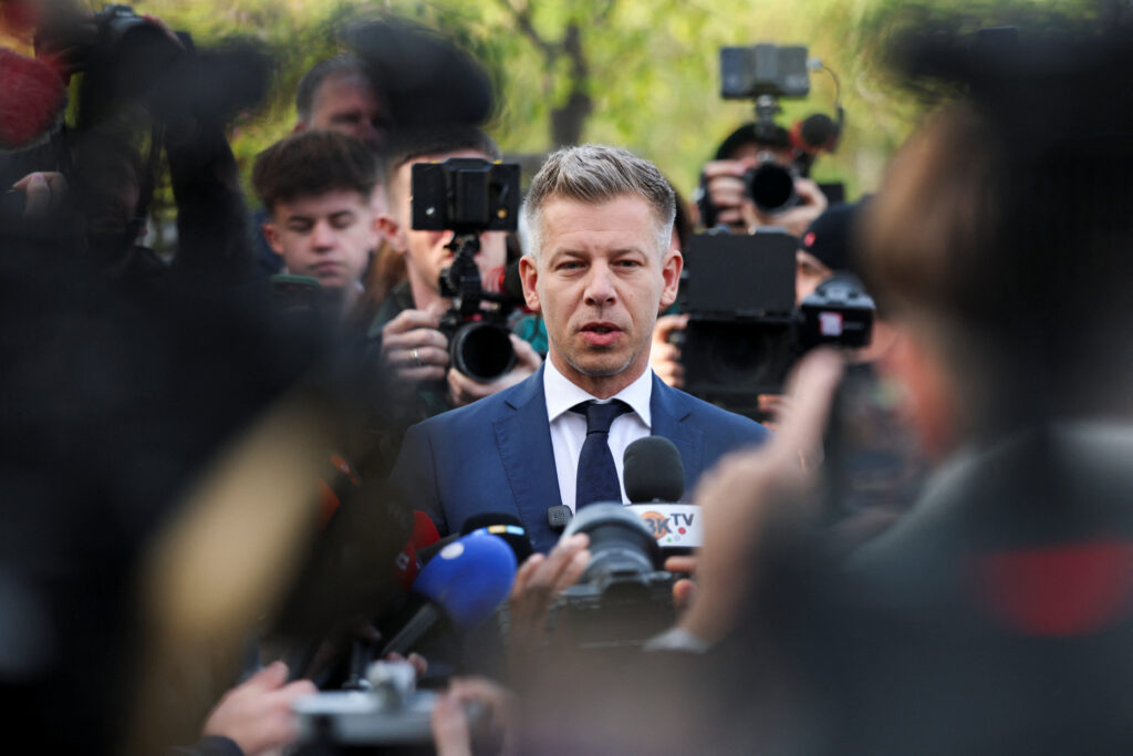 Peter Magyar, leader of the opposition Tisza party, speaks to the media after voting during the Hungarian parliamentary election in Budapest, Hungary, April 12, 2026. REUTERS/Leonhard Foeger